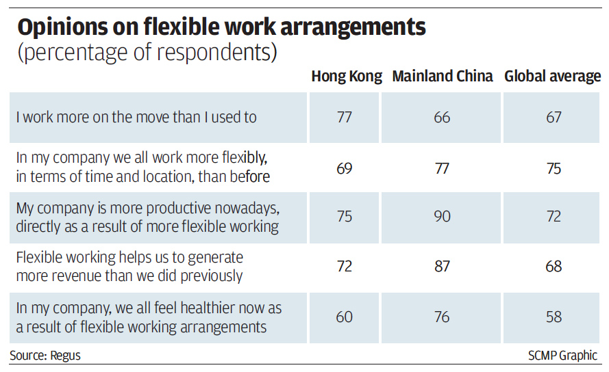 Among those polled in Hong Kong, 75 per cent said that flexibility boosted productivity, while 72 per cent agreed that it could help increase revenue.